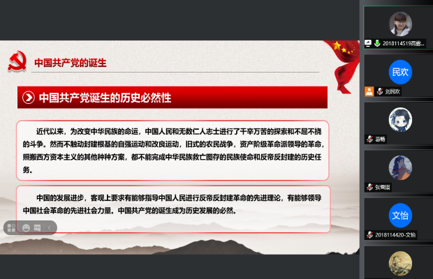 本18级第三党支部通过腾讯会议线上开展了暑期党史自学读书会,支部内每一位党员在暑假期间都积极学习党史,通过这次机会每位党员挑选自己印象最深刻的一段党史,借助PPT展示,向支部内其他成员讲述党史故事,并分享自己的个人心得体会。本次活动由本18级第三党支部组织委员刘民欢同志主持,本18级第三党支部全体党员参加。
