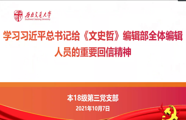 2021年10月7日,本18级第三党支部开展了学习“习近平总书记给《文史哲》编辑部全体编辑人员的重要回信精神”的组织生活会,学习了回信的主要内容和精神。本次会议由党支部宣传委员冯媛橼同志主持,党支部全体成员参与,在腾讯会议举行。