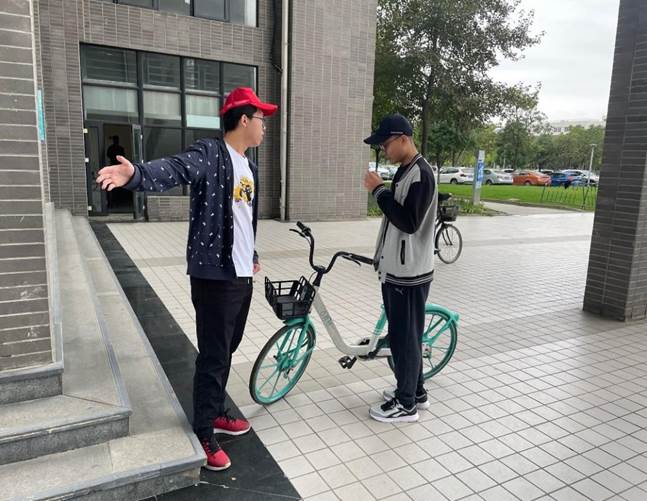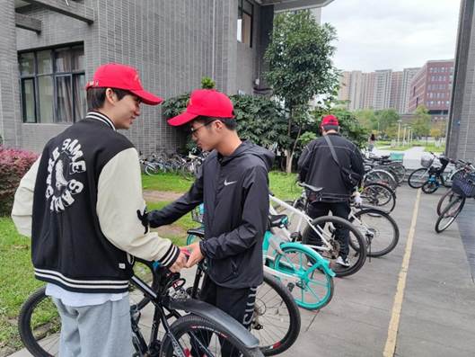 活动期间,四位同学选择了人流量较少的时间段,对四教楼下乱停乱放的自行车进行集中整理摆放。同时也对部分不规范停车的同学进行了教育引导,引导他们把共享单车规范停放在停车区内。