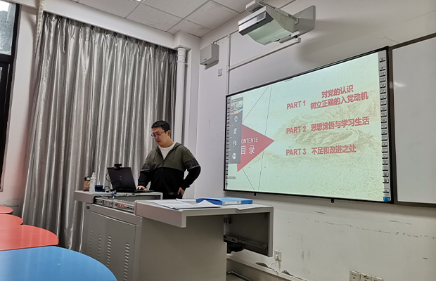 候选人栗帅帅也利用PPT进行了自我陈述。他通过自己的成长历程、身边的榜样以及先锋模范阐述了自己的入党动机,通过“青年大学习”、“学习强国”、党史学习情况以及参加志愿活动情况表达了自己的思想与品行。在学习方面,努力完成学业,积极参加科研活动,获得了良好的成绩。他还表示争取青年大学习全部完成,参与更多的党员活动。