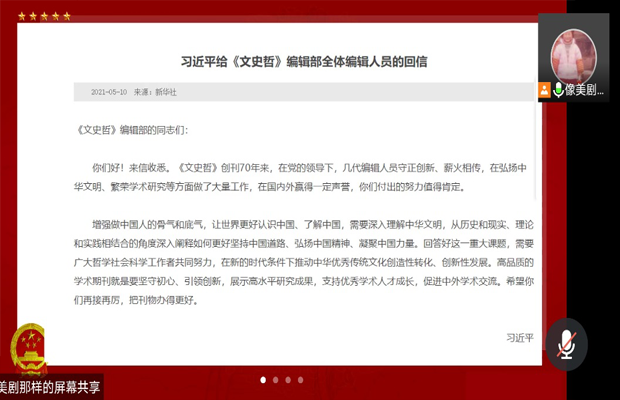 接着进行第二项活动——学习习近平总书记给《文史哲》编辑部全体编辑人员回信精神。全体党员认真学习了习近平总书记给《文史哲》编辑部全体编辑人员的回信内容。与会同志纷纷表示将致力于为解决现代性问题和时代难题,贡献中国智慧,在新的时代条件下,不辜负总书记的嘱托和期许,努力建设中国特色的哲学社会科学,为以中国智慧助推中国道路贡献山大力量。同时党员要发挥青年学子敢闯敢干、勇于争先的奋斗精神,从而不辜负总书记的殷切期望,抓住机会、主动担当,在新时代背景下为解决哲学社会科学的学术问题和社会发展的现实问题而努力奋斗,展现青年人的力量。
