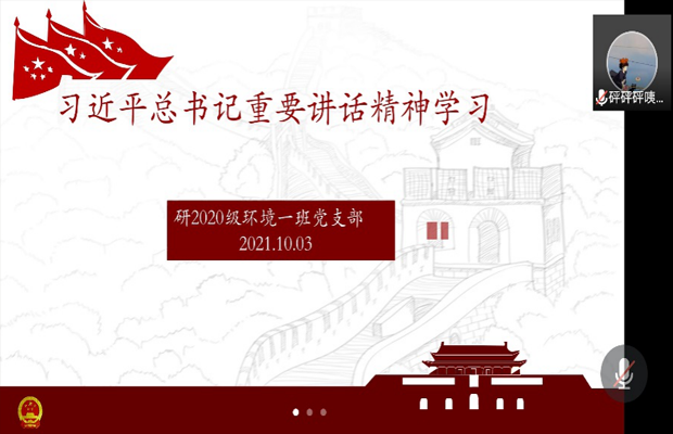 2021年10月3日星期日晚上九点,研20级环境一班党支部通过腾讯会议开展了线上组织生活会,主要内容为:学习习近平总书记在中国科学院第二十次院士大会、中国工程院第十五次院士大会、中国科协第十次全国代表大会上的讲话精神以及给《文史哲》编辑部全体编辑人员回信精神。本次组织生活会20环境一班党支部书记李佳琪主持,20环境一班党支部全体党员发展对象积极分子参加。