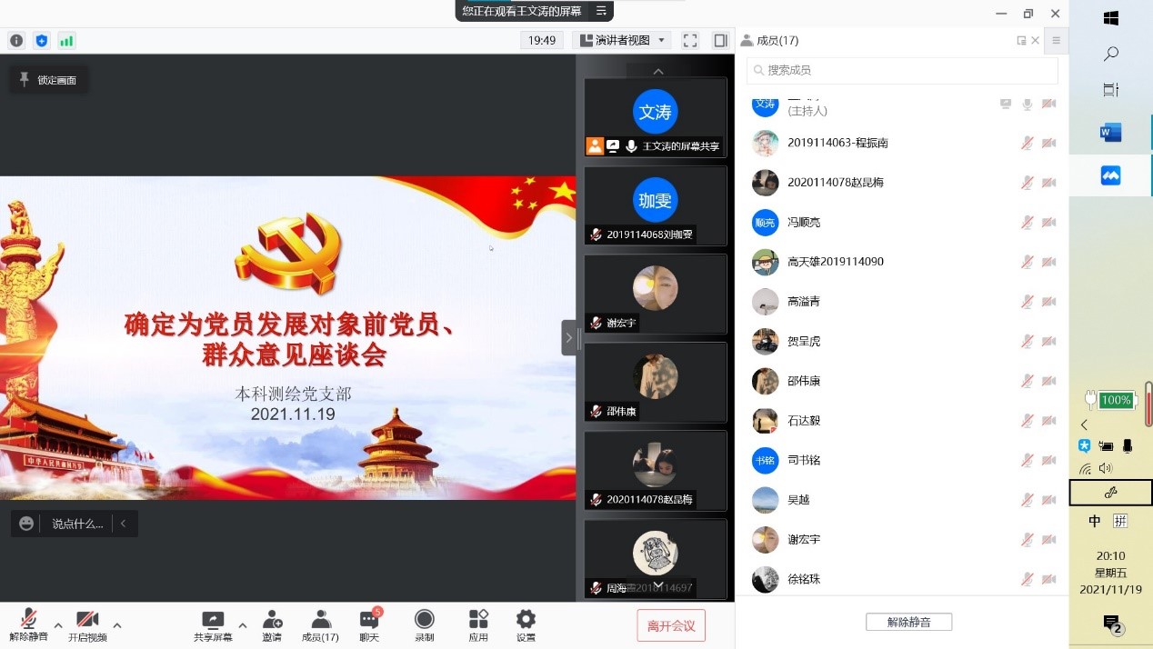 在座谈会结束后,本科测绘党支部于2021年11月21日下午3点于线上开展了发展对象人选“推优入党答辩”大会,本次大会由党支部书记王文涛主持,全体支部成员参加。