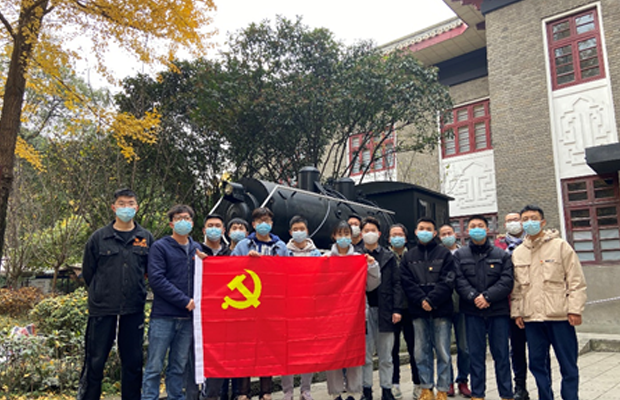 的建校历史相呼应,于是支部全体成员在纪念馆门口以火车头为背景拍摄了一张合影。