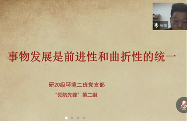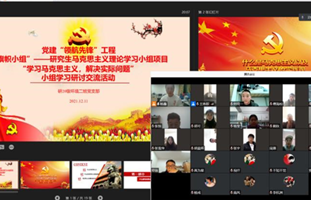 研20级环境二班党支部于2021年12月11日在线上开展了党建“领航先锋”活动之——“旗帜小组”学习成果研讨交流活动,分享近期阅读马克思主义原著等书籍的学习心得。此次活动由党支部书记杨鑫主持,研20级环境二班党支部全体成员参与。