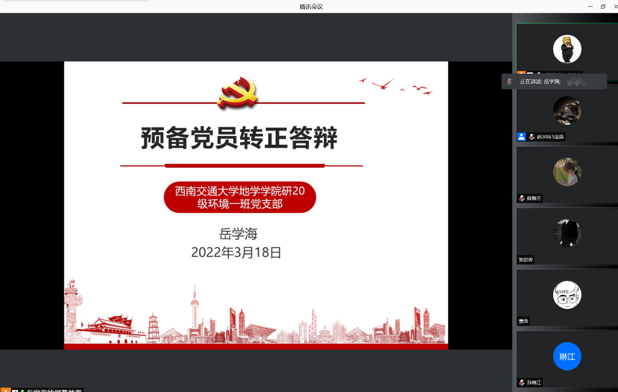 2022年3月18日星期五下午两点,研20级环境一班党支部于X4132召开预备党员转正大会。本次大会由支部书记李佳琪主持,采用线上及线下相结合的方式召开会议,研20级环境一班党支部全体党员参加。参加本次会议有表决权的正式党员实到会人数超过应到会人数的一半,符合组织规定,大会有效。本次会议的主题是讨论关于预备党员岳学海、冯可和陈璐瑶的转正问题