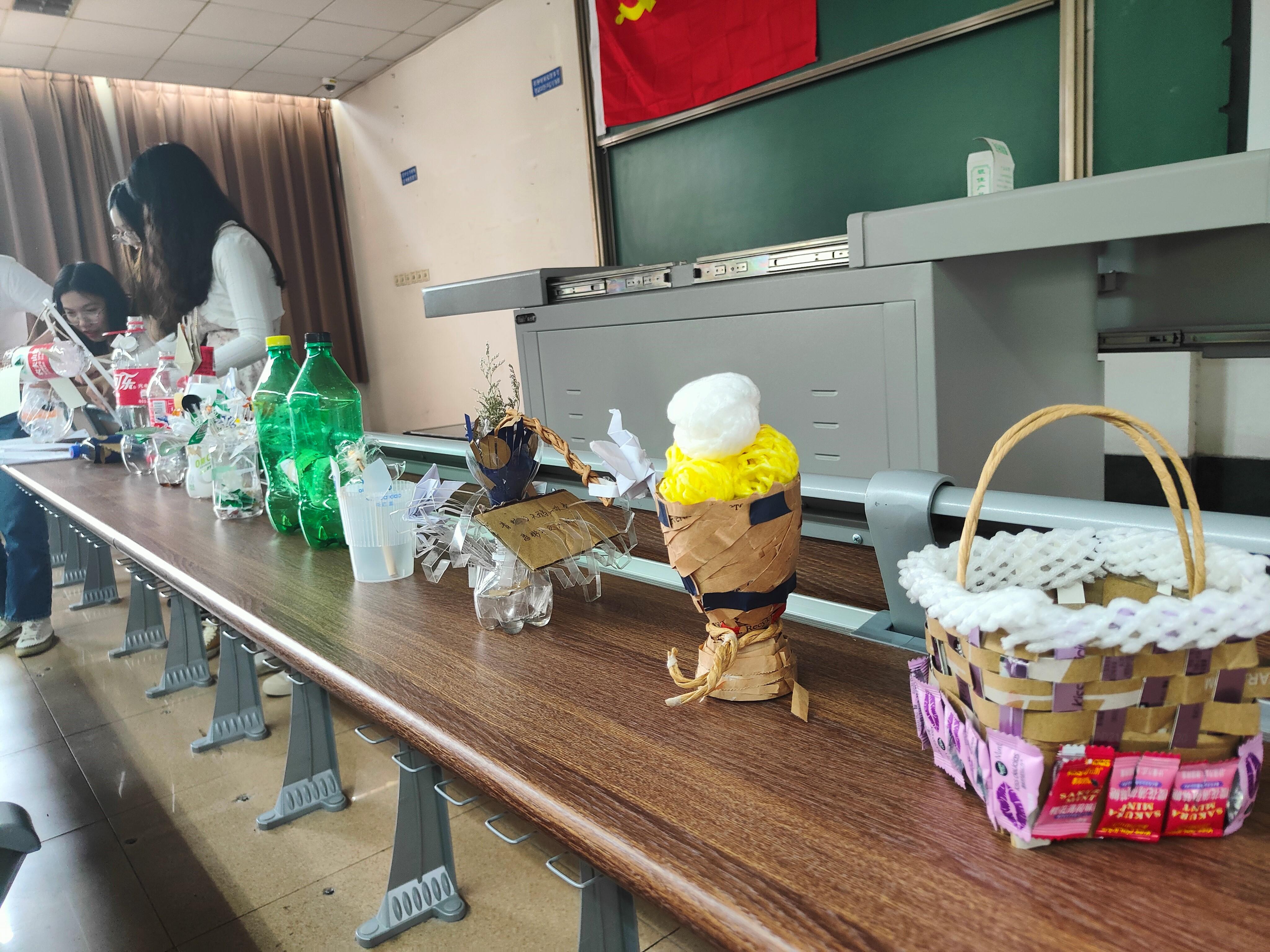 在重“塑”实验室环节中,同学们利用收集的塑料制品等材料进行环保手工制作,大家参与热情高涨,通过奇思妙想,制作了环保手篮、环保手账、塑料哑铃、手工塑料花、塑料菠萝、塑料花瓶等手工艺品16件;通过环保手工制作,体现了同学们对于环保行业的热爱,也展现了同学们天马行空的想象力。
