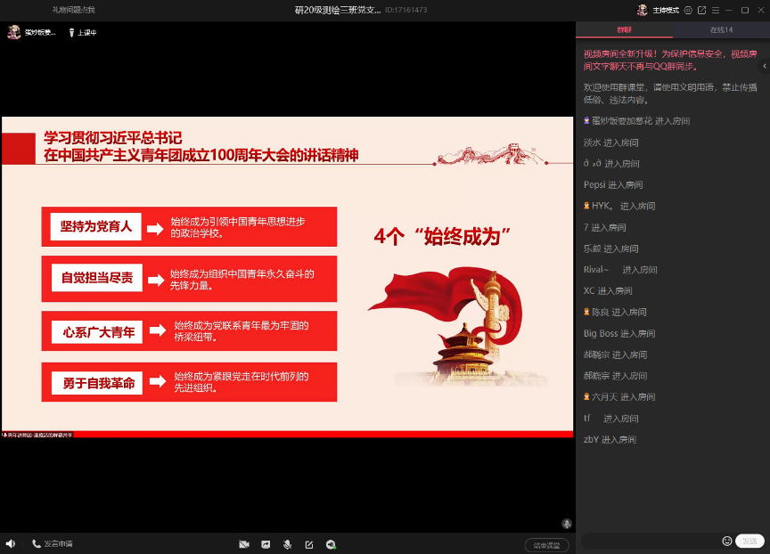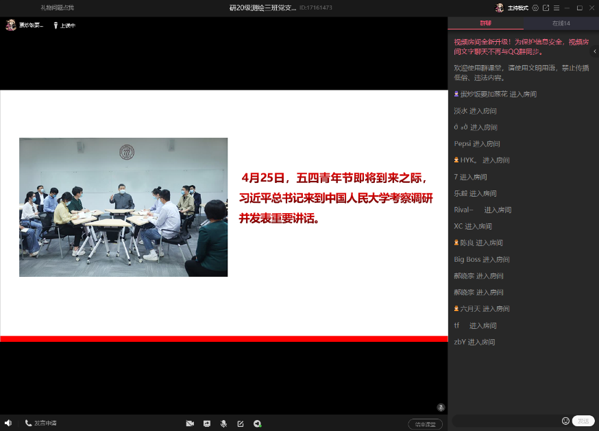 4月25日,在五四青年节即将到来之际,中共中央总书记、国家主席、中央军委主席习近平到中国人民大学考察调研,与师生代表面对面交流谈心,并发表了重要讲话。5月10日,习近平总书记出席庆祝中国共产主义青年团成立100周年大会,并发表了重要讲话。在学院党委的指示下,2022年5月24日晚八点,研20级测绘三班党支部于线上开展了相关学习活动。本次学习活动由支部逄雅洁同志领学。