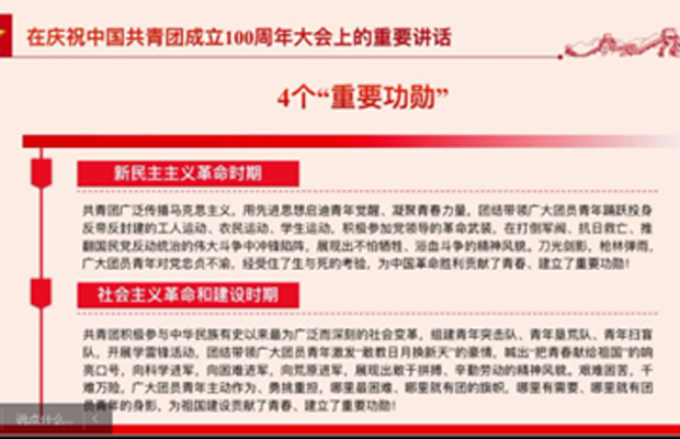 其后,邢本聪同志组织支部同学一齐观看由共青团中央制作的《100年,共青春!》视频,感受百年征程中涌现出一批又一批建设祖国、奉献青春的青年无畏豪情,青年精神永闪熠光。