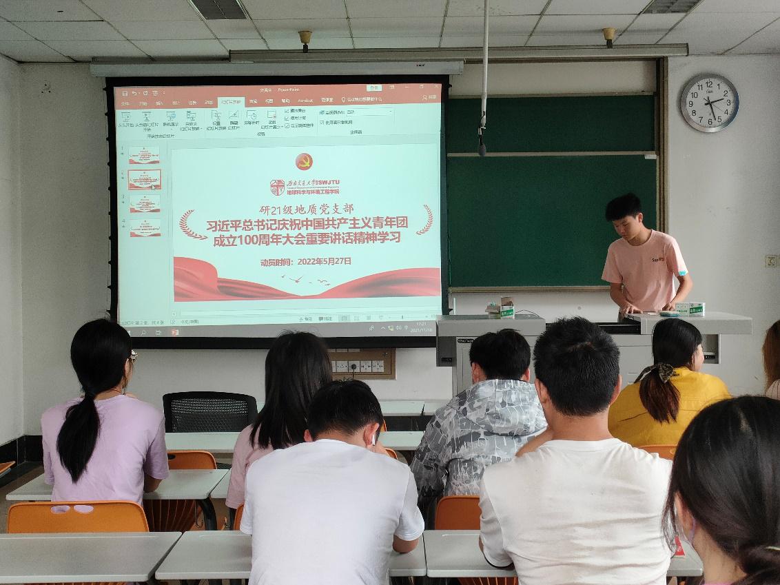 为加强支部思想工作建设,2022527日星期五下午200,研21级地质党支部在线下4221教室集中开展学习贯彻习近平总书记重要讲话精神主题党日活动,会议主要内容为:学习习近平总书记在庆祝中国共产主义青年团成立100周年大会上的重要讲话精神暨“领航先锋”理论学习活动学习成果交流会。本次会议由研21级地质党支部宣传委员张宏洋主持,参加此次活动的有研21级地质党支部全体正式党员、预备党员以及9名入党积极分子。