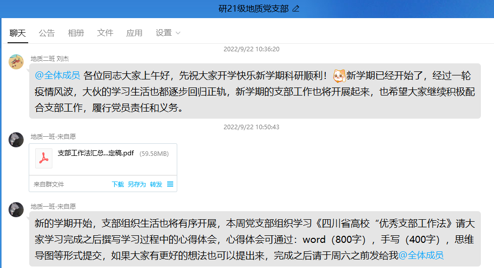 为加强支部的规范化建设,号召支部全体党员投入到支部建设的实际工作中,了解支部在各方面工作的具体内容,同时也学习其他优秀示范党支部的优点长处,结合上级党委工作指示,于2022922日星期五上午1000,研21级地质党支部在线上集中开展学习《四川省高校“优秀支部工作法》,主要学习优秀党支部的各项工作经验,并要求全体支部成员在学习完成后提交自己的心得体会,由支委会负责收集。本次学习活动由研21级地质党支部组织委员宋自愿主持,参加此次活动的有研21级地质党支部全体正式党员及预备党员。