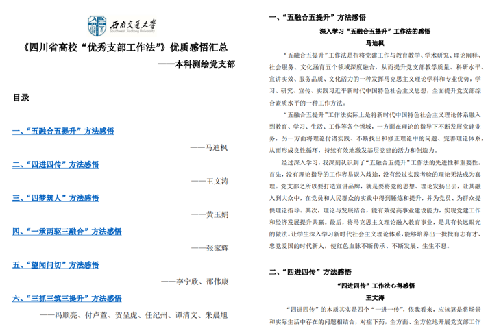 中共四川省委教育工委开展“优秀支部工作法”推荐评选活动,按照“可学习、可借鉴、可复制、可推广”的原则,择优确定了20个“优秀支部工作法”。鉴于疫情部分党员同志未在校的情况,本科测绘党支部采用“阅读征稿-汇总整理-分享学习”的方式,于2022年9月22日在线上进行了“优秀支部工作法”的学习心得感悟征稿,征稿面向本科测绘党支部党员和全体积极分子。