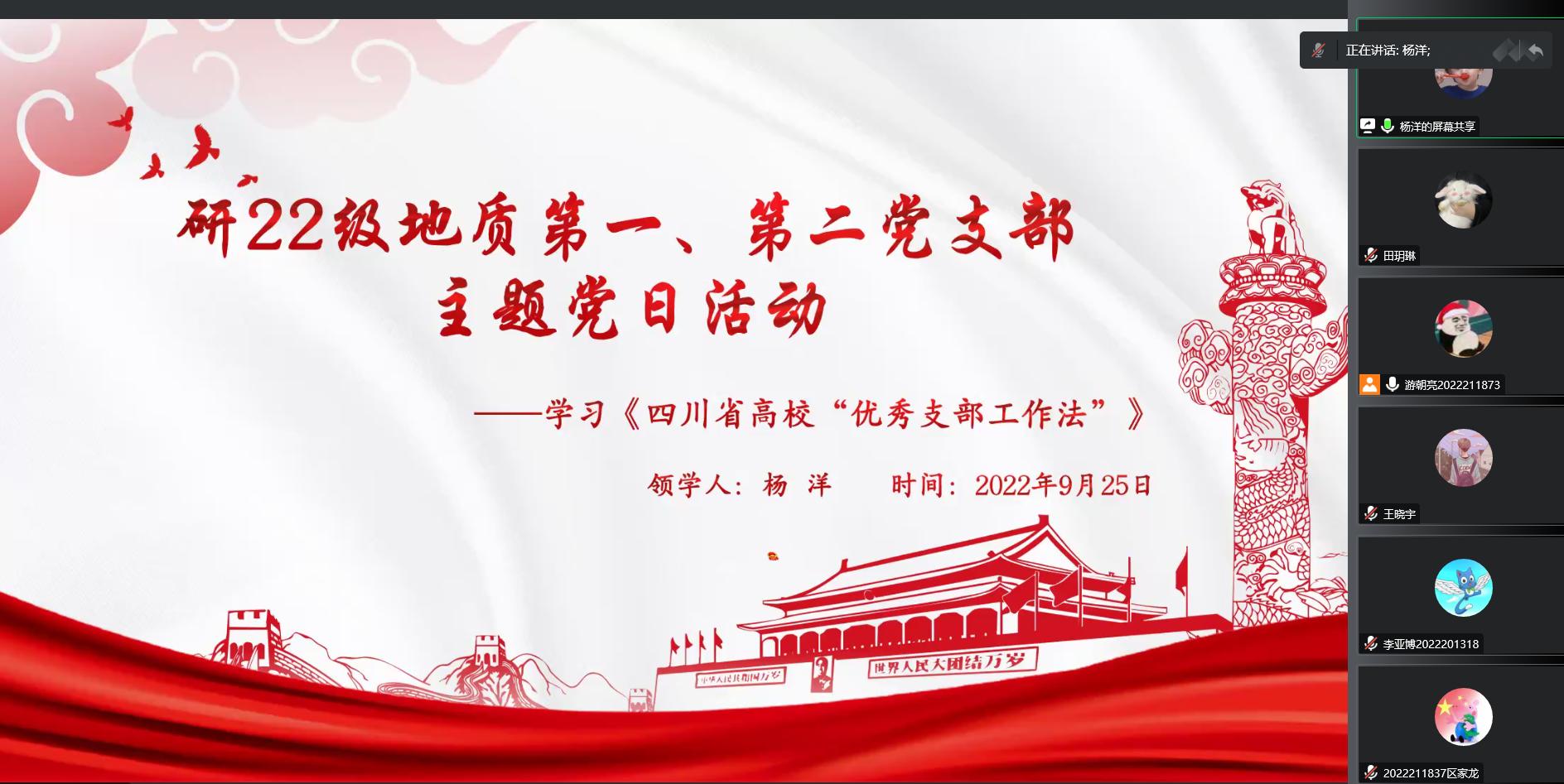 2022年9月24日晚上7点,研22级地质第一党支部和地质第二党支部联合开展了线上《四川省高校“优秀支部工作法”》专题学习活动,通过省委教育工委开展“优秀支部工作法”推荐评选活动,由各个高校共同参与,旨在贯彻落实习近平总书记来川的重要指示精神和省第十二次党代表大会决策部署,不断探索创新,激发党员内在动力和支部活力,最终择优确定了20个“优秀支部工作法”供大家学习。本次会议第一党支部活动由党支书杨洋同志主持,党支部内所有党员参加。