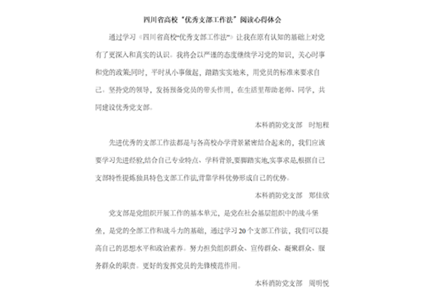 针对党的十八大以来四川省高校党支部在组织发展过程中存在的问题,2021年9月省委教育工委开展“优秀支部工作法”推荐评选活动,按照“可学习、可借鉴、可复制、可推广”的原则,择优确定了20个“优秀支部工作法”。为了更好发挥党支部的战斗堡垒作用和党员的先锋模范作用,深化支部成员对高校党建工作的认识和理解,本科消防党支部于9月23日至9月25日组织进行了《四川省高校“优秀支部工作法”》专题学习活动。本次活动由党支书高一帆同志组织,支部全体共10位党员、预备党员自行学习文件后参与线上交流并分享学习心得。