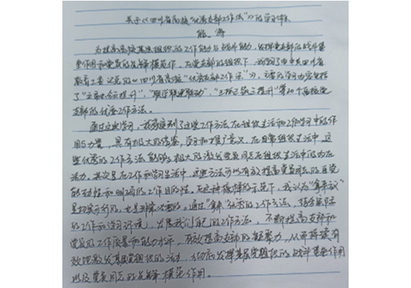 熊涛同志通过本次学习,感受到“优秀支部工作法”在组织生活和工作学习中的作用与力量,具有极大的借鉴、学习和推广意义。在日常组织生活中,这些优秀的工作方法能够极大地激发党员同志在组织生活中地内在活力;在工作和学习中,这些方法能有效地提高党员同志的自觉能动性和明确的工作目的性。