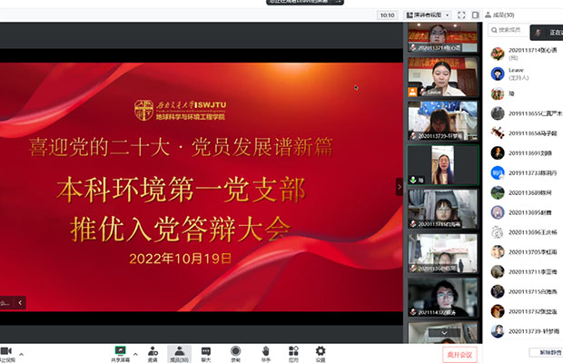 2022年10月19日,受疫情影响,本科环境第一党支部在腾讯会议召开2022-02期发展对象答辩大会。本次活动由本科环境第一党支部书记刘烨同志主持,本科环境第一党支部全体党员参与。