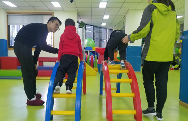 器材室中,吕继超同学和中心老师一起为小朋友们制作描绘底卡、从器材库中配备上课所需的道具和进行其他课程准备工作;支部的四名志愿者分别在不同训室配合老师进行课程教学。孩子们经常分散注意力去做其他事情并且学习得非常缓慢,但是志愿者们还是不断地用热情去吸引他们,不厌其烦地指导他们;另外三名志愿者在中心感统室带领孩子们做运动训练,每位志愿者分别引导辅助一名孩子做荡秋千、踩高跷、爬楼梯和跳蹦床等活动,并守护着他们的安全。感统室中配有一系列平衡游戏设备、攀爬游戏设备和软体游戏设备,四周覆盖着软垫,能让孩子们在其中安全地进行多项训练科目,提升他们的感觉统合能力。