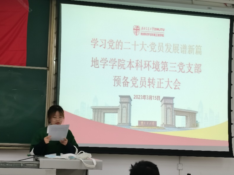 本科环境第三党支部于2023年3月15日 19:30在X2213召开预备党员转正大会,本次会议由代雅姗同志主持。