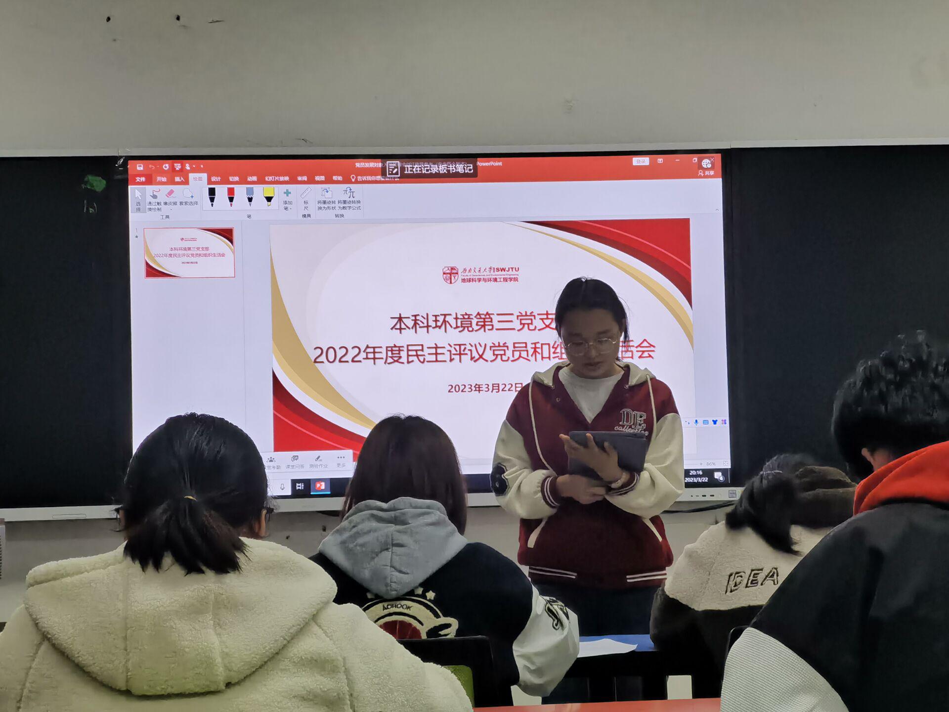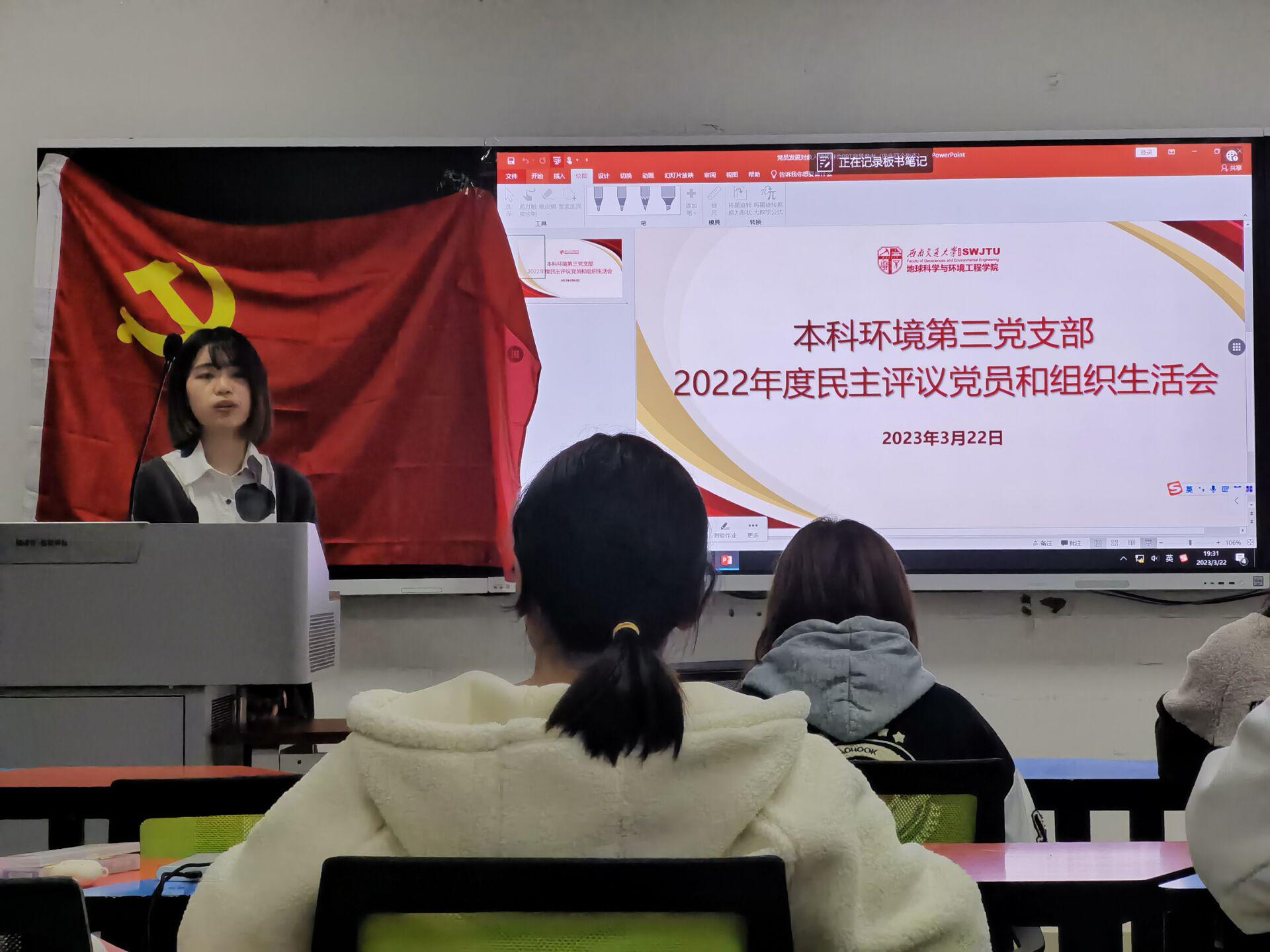 为深入学习贯彻党的二十大精神,坚持不懈用习近平新时代中国特色社会主义思想凝心铸魂,本科环境第三党支部根据学院党委下发的《关于召开2020年度基层党支部组织生活会和开展民主评议党员的通知》要求,于3月22日在X4133开展组织生活会和党员的民主评议,本次会议由党支部书记钟若兰同志主持。