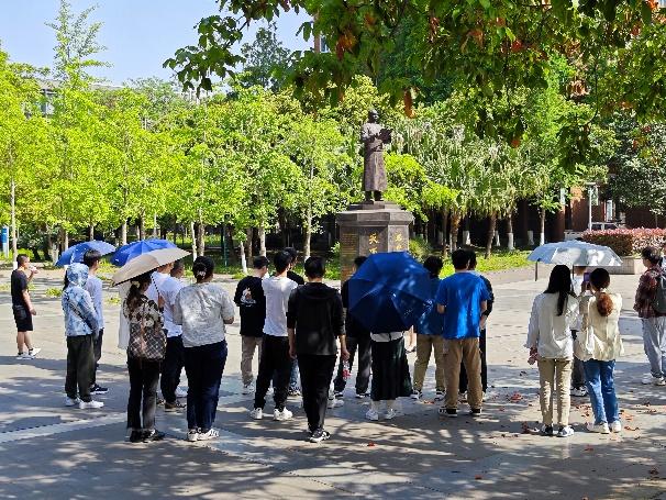 4月15日上午10时,三校的党支部成员齐聚西南交通大学犀浦校区,首先由学校大使团成员带领大家参观校园校史文化雕塑,先后参观了林同炎先生、严恺先生、张维先生、孙中山先生等纪念像,并着重介绍了作为交大地标和象征的竢实扬华碑,石碑左边,是“帝国铁道学院”的文凭;石碑的右边是校歌曲谱:“翳唐山,灵秀钟。我学院,声誉隆。这是交大精神的完美诠释,号召研究生党员要求真务实的做学问,为振兴中华做出杰出贡献。