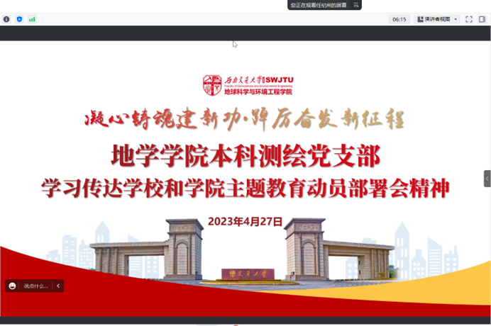 为深入学习传达学校和学院主题教育动员部署会精神,明确党支部下一阶段的工作重点方向,同时为为深入学习贯彻习近平新时代中国特色社会主义思想和党的二十大精神,深入贯彻落实学校第十五次党代会战略部署,充分发挥先进典型、模范人物的示范表率带动作用,本科测绘党支部于2023年4月27日晚19:00线上开展“践行二十大精神——筑牢国家安全校园防线”主题党日活动暨两优一先评选支部党员大会。本次活动由党支部书记任纪州主持,党支部全体党员出席本次会议。