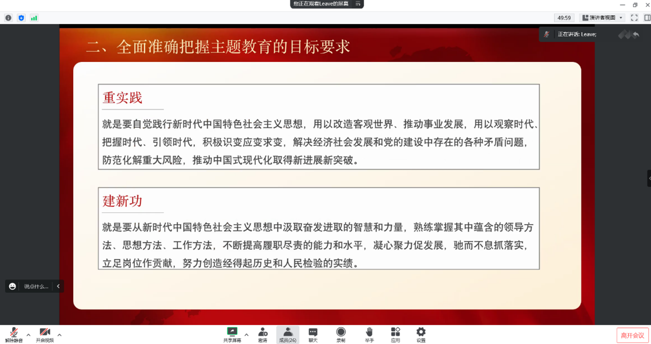 接着,刘烨同志介绍了本次主题教育的总要求:学思想、强党性、重实践、建新功。深入学习后,刘烨同志对全体党员提出要求,要深入学习领会习近平总书记在中央主题教育工作会议上的重要讲话精神,在牢牢把握总要求的基础上,坚持学思用贯通,知信行统一,努力在以学铸魂、以学增智、以学正风、以学促干方面取得实实在在的成效。