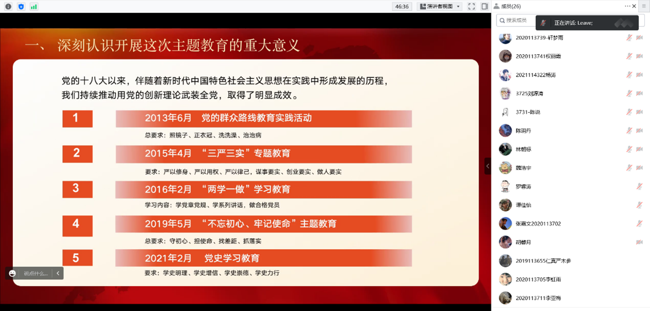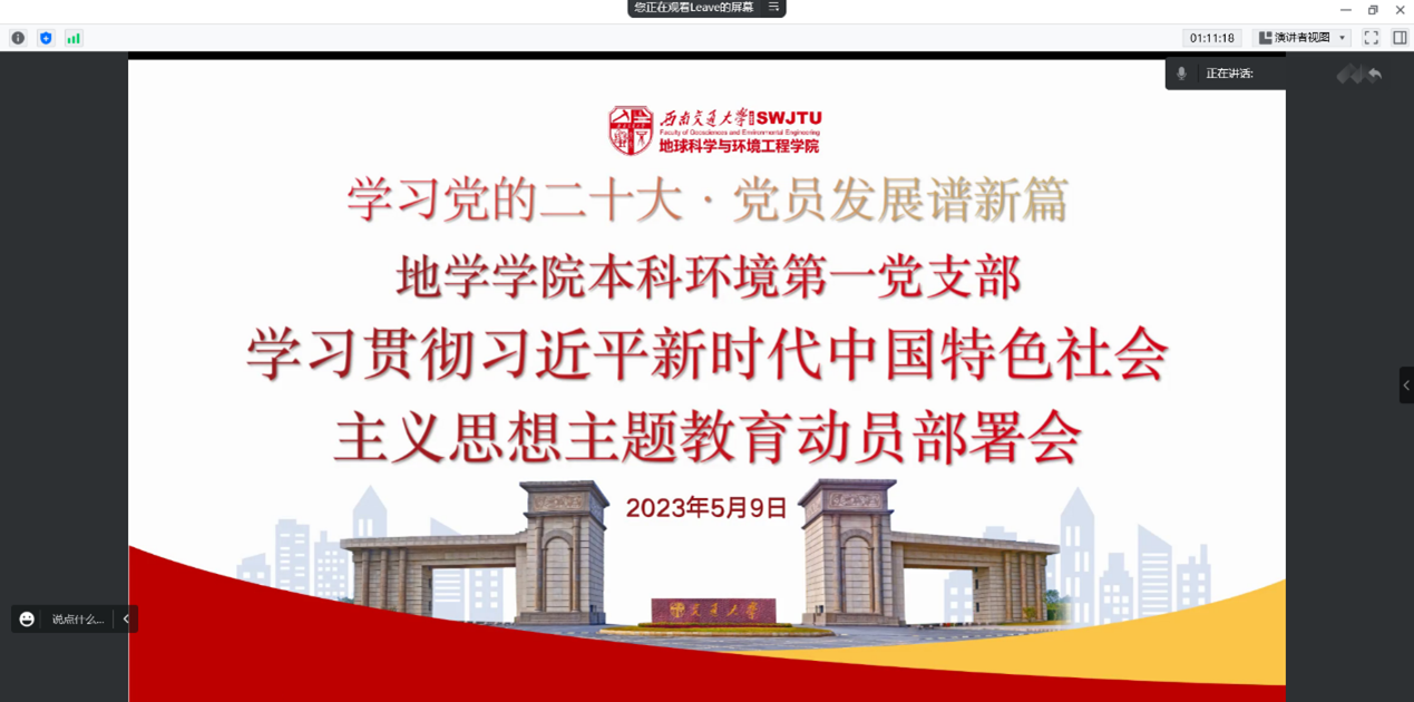 2023年5月9日晚18:00,本科环境第一党支部线上开展了“学习贯彻习近平新时代中国特色社会主义思想”主题教育动员部署会,会议主题是传达校、院党委关于主题教育部署的相关精神和结合支部情况规划日后主题教育时间安排。本次活动由支部书记刘烨同志主持,本科环境第一党支部全体党员参与。