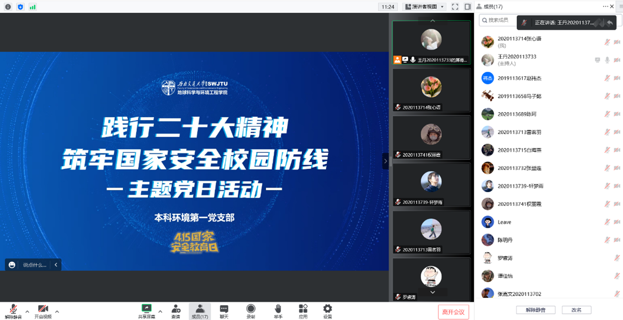 4月15日是国家安全日,为深入贯彻落实党的二十大精神,全面加强学校国家安全保密教育,切实提升学校师生国家安全保密意识和保密常识,筑牢维护国家秘密安全的校园防线,本科环境第一党支部于5月9日晚19:00线上开展了“践行二十大精神—筑牢国家安全校园防线”主题党日活动。本次活动由本科环境第一党支部副书记王丹同志主持,本科环境第一党支部全体党员参与。