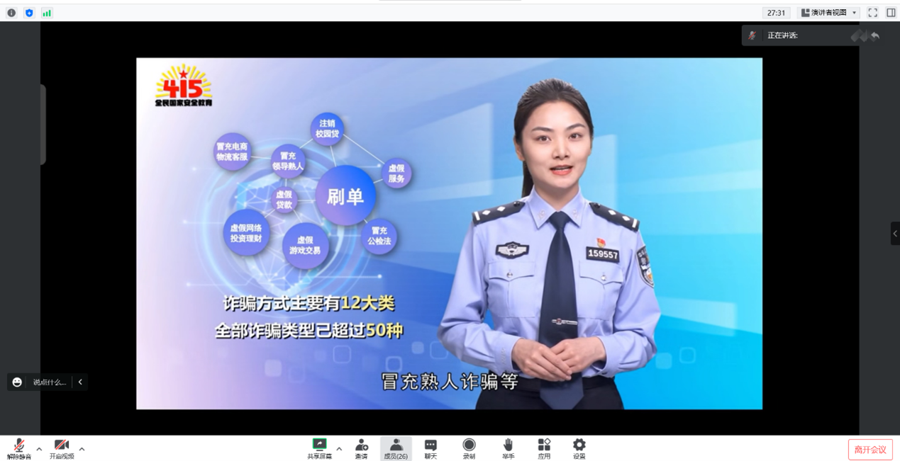本次会议的主要内容是视频学习。支部全体成员共同观看了“同上一堂国家安全思政大课”,进一步了解了国家安全保密法律法规和保密知识技能,增强了自身保密防范意识,有效掌握了安全保密防范技能,筑牢了国家安全校园防线。