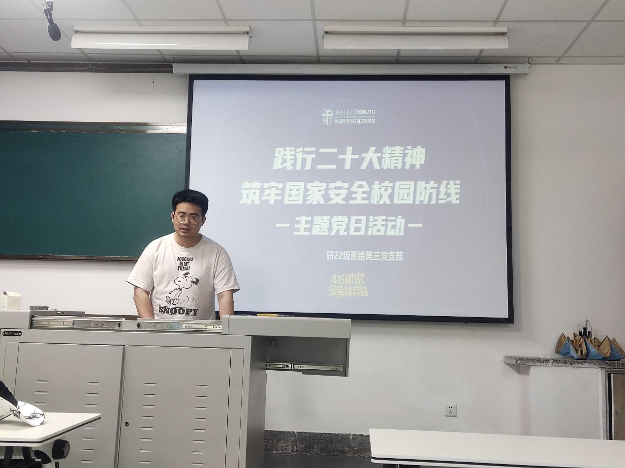 研22级测绘第三党支部在J2624教室顺利召开“践行二十大精神,筑牢国家安全校园防线”主题党日活动,活动的主题是普及国家安全保密法律法规和保密知识技能,增强支部成员保护国家安全的意识,使支部成员有效掌握安全保密防范技能,牢筑保密思想防线。本次会议支部所有党员均参加,会议由党支部组织委员杨成明同志主持。