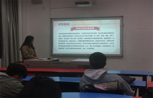 最后,李国欣老师讲解了条例中强调的党支部工作必须遵循的五个原则、高校党支部工作总体要求、党支部基本任务、党支部组织生活要求,并要求学生党员应将先锋模范作用发挥充分,严格遵守党章与党纪党规,带头遵守国家法律和校纪校规,做遵纪守法的标杆。