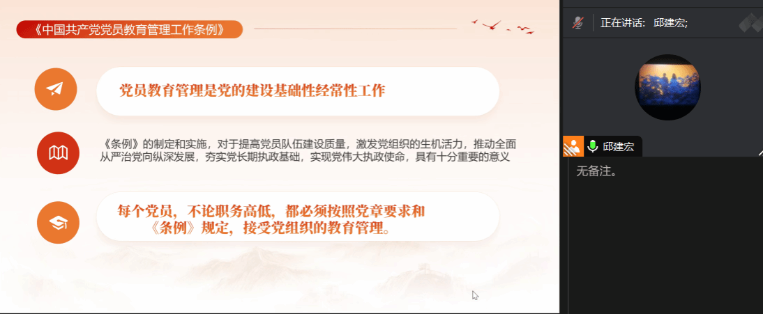 最后,邱建宏同志依据本支部实际情况组织学习了中国共产党党员教育管理工作条例,并就支部请销假制度做了详细说明,强调了党组织日常管理纪律和要求。
