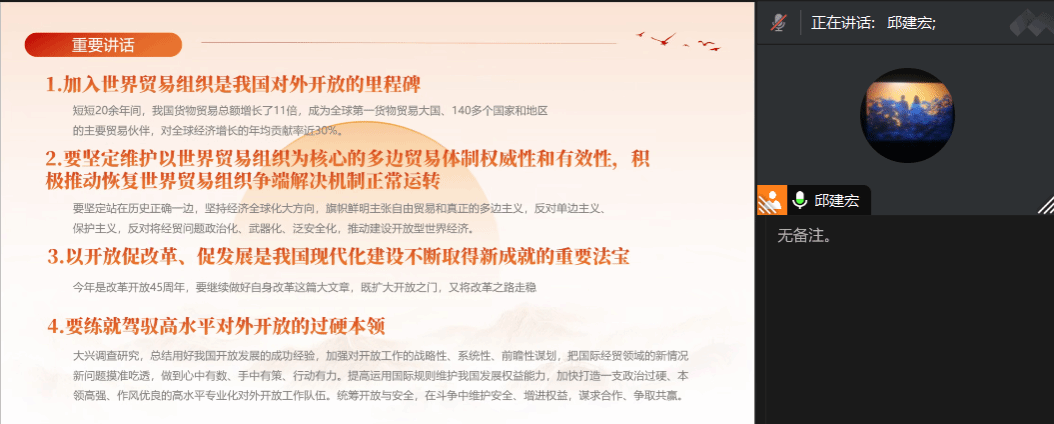 在会上,邱建宏同志首先带领与会党员认真学习了以加入世界贸易组织是我国对外开放的里程碑、要坚定维护以世界贸易组织为核心的多边贸易体制权威性和有效性、积极推动恢复世界贸易组织争端解决机制正常运转、以开放促改革、促发展是我国现代化建设不断取得新成就的重要法宝和要练就驾驭高水平对外开放的过硬本领等四个方面为核心的会议精神,强调了宣传思想文化工作在党和国家中的重要地位。