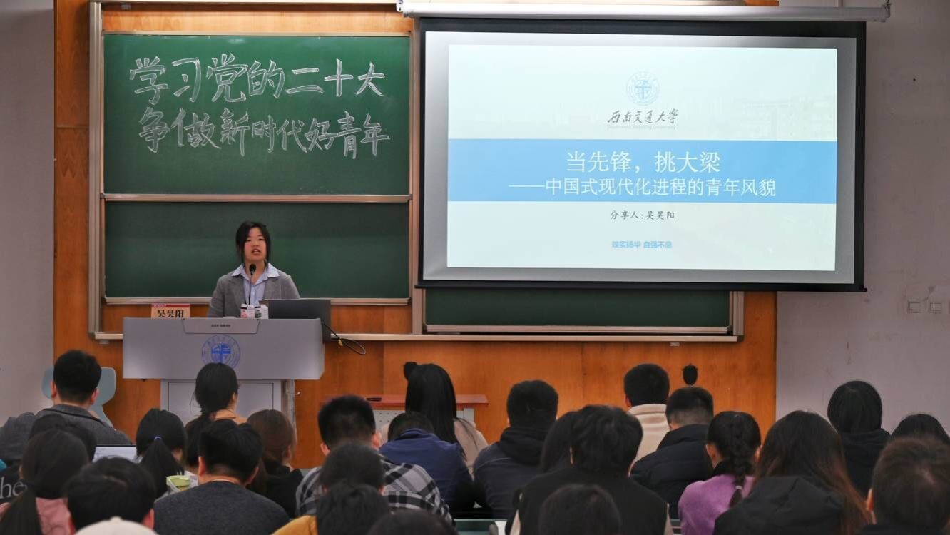 宣讲伊始,吴昊阳以《当先锋,挑大梁——中国式现代化进程的青年风貌》为题,从当代青年的心理特点出发,引用习近平总书记对青年人的寄语“厚植家国情怀、涵养进取品格,以奋斗姿态激扬青春”,结合戍边战士陈祥榕、“扶贫之花”黄文秀以及西南交通大学优秀校友、“中国青年五四奖章”获得者龙斌的鲜活故事,引导全体党员将小我融入大我,将个人的奉献精神融入时代洪流,鼓励大家立足专业,将人生理想与热爱融入到实现中华民族伟大复兴的奋斗中。