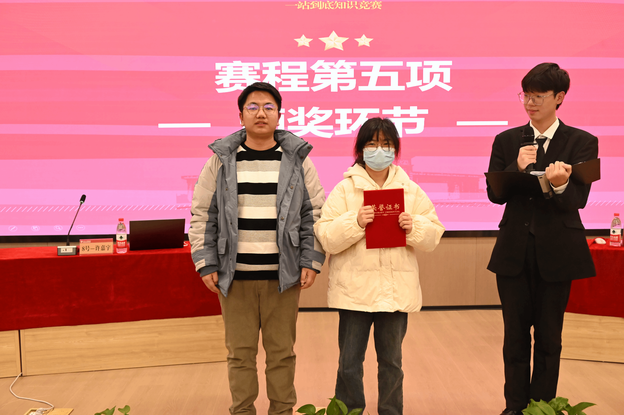 三轮比赛后,场上仅剩六位选手参与角逐,第四轮为车轮战赛制,又一场激烈比拼后,来自机械工程学院的马雨歌同学脱颖而出,荣获本次比赛的一等奖。在发表获奖感言时,马雨歌同学表示了对学院和同学朋友的感谢,并祝愿“一站到底”知识竞赛能够越办越好。