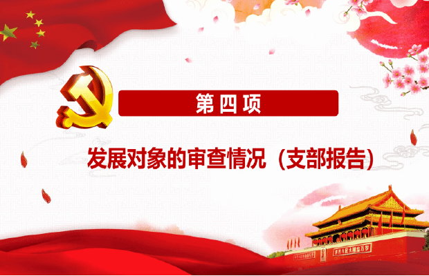 会议第四项,由支部组织委员汇报发展对象的审查情况。龚依婷同志表示,根据一段时间的考察培养,可以看出令狐文娅同志在思想政治上能够始终同党中央保持一致,认真贯彻执行党的路线,方针,政策,政治立场更加坚定;工作上扎实肯干、兢兢业业、任劳任怨;并通过同本人谈话,查阅有关档案材料,找有关单位和人员或函调了解,其本人,直系亲属及联系密切的主要社会关系是清楚的。现根据本人申请和一贯表现:在广泛征求党内外党员、群众意见的基础上,经过支部委员会充分酝酿和认真讨论,一致认为令狐文娅同志基本具备党员条件,决定提交支部党员大会讨论其能否被接受为预备党员的问题。