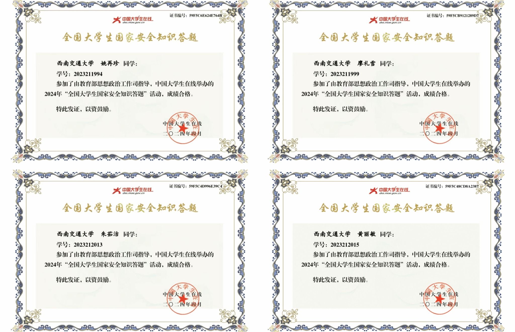为响应学院号召,支部成员在直播结束后,积极参与了“全国大学生国家安全知识答题”活动。本次活动旨在通过线上答题的方式,普及国家安全知识,提升大学生的国家安全意识。支部中多位同学积极参与了答题活动,并获得了国家安全知识竞赛证书。他们表示,通过答题,不仅巩固了国家安全知识,还进一步认识到了国家安全的重要性。