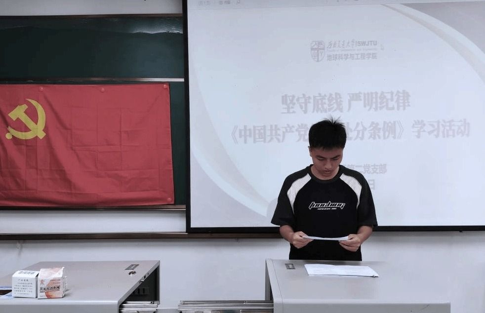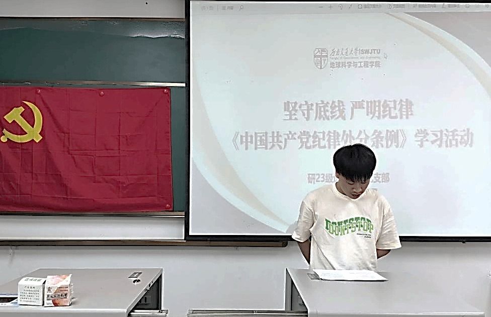为深入贯彻习近平总书记关于党的纪律建设的重要论述,强化党员纪律意识,进一步推动党纪学习教育工作深入开展,2024年5月13日,研23级地质第二党支部在J2624内举行“领航先锋”——研究生马克思主义理论小组学习启动会暨“严守底线 严明纪律”《中国共产党纪律处分条例》学习活动。此次活动紧密结合学校党委的工作部署和具体要求,以《中国共产党纪律处分条例》为学习重点,旨在引导支部内全体党员深刻理解和准确把握党的纪律要求,进一步提升党性修养。