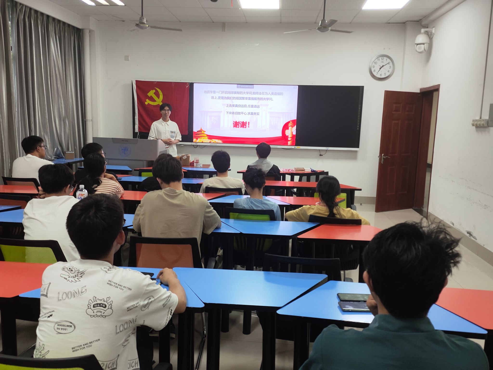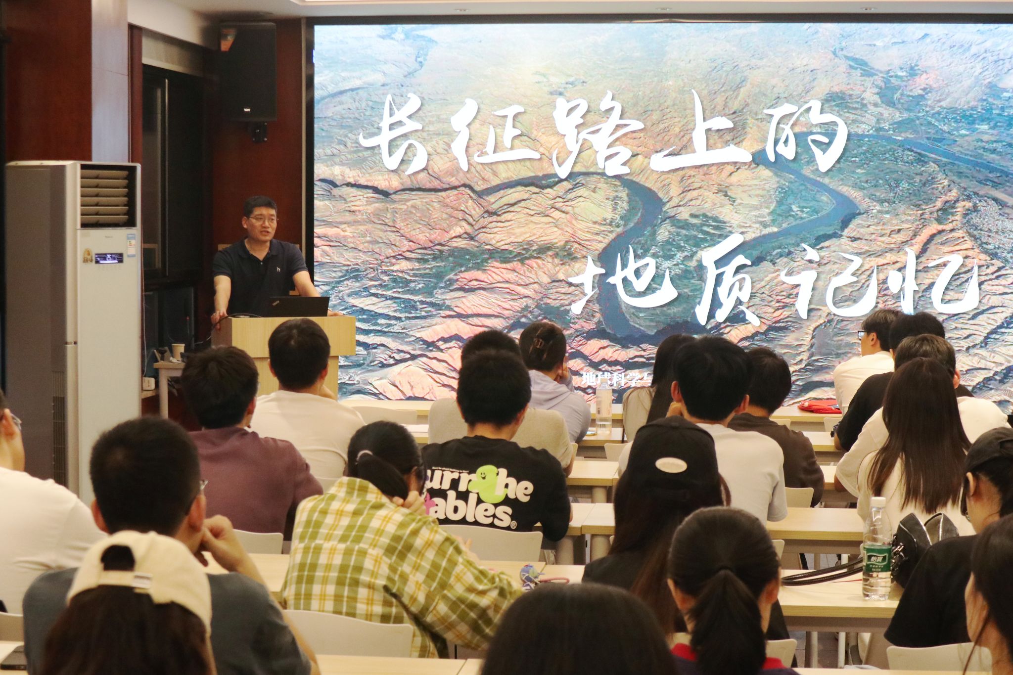 随后,杨洋同志为大家讲授了《地质的“风雨”75周年》专题党课。“在我们这样一个伟大的社会主义国家里,我们中国人民有志气、有力量克服一切科学技术上的困难,去打开这个无比庞大的热库,让它为人民所利用。”杨洋同志用李四光的话引入,介绍了地质事业在为中国走上工业化道路做出的突出贡献。杨洋同志强调,地质学不仅是一门开启地球奥秘的大学问,更是为我们祖国繁荣富强服务的大学问。他勉励各位同学,作为一名地质工作者,要始终走在为人类造福的路上,应做到“上去果真穷远目,下来依旧放平心”,既要仰望星空,也要脚踏实地,以奋斗之姿铸国家辉煌。