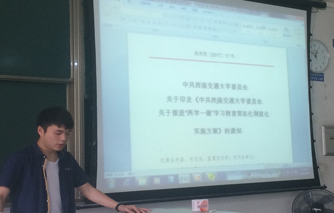 6月5日,西南交通大学地球科学与环境工程学校2013级测绘党支部召开了全体党员干部会议,传达学习了习近平总书记对“两学一做”学习教育常态化制度化的重要指示和校推进“两学一做”学习教育常态化制度化工作部署会议精神,宣读了西南交通大学《关于开展“两学一做”学习教育常态化制度化实施方案》。
