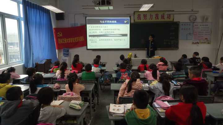 平心而论,大多数学生没有坐过高铁,一部分坐过火车,为了四年级的小朋友理解有砟轨道和无砟轨道的区别,台上的“老师”在黑板上画示意图,动用丰富的肢体语言,讲解高铁动车的动力来源。结合最近升天的神舟十一号,“老师”大致展示了我国航天事业从初期起步阶段到目前为止卓越的成就,同学们也为我国的一个个创举深感骄傲。