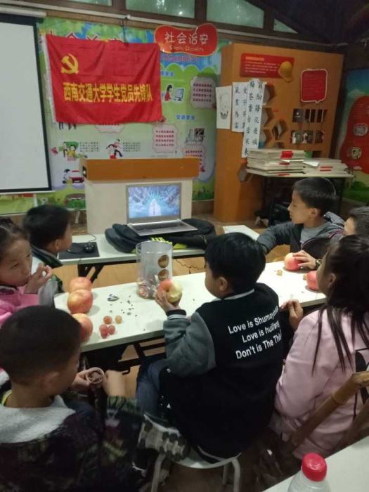 临走之前的问答环节,队员们准备了一些学校的纪念品,写有竢实扬华的笔记本代表一份希望,萌翻交大的地图让同学们惊叹于大学生活的丰富多彩,最后连队员们别在身上的校徽都送了出去,直到支教结束小朋友都还一直戴在身上。