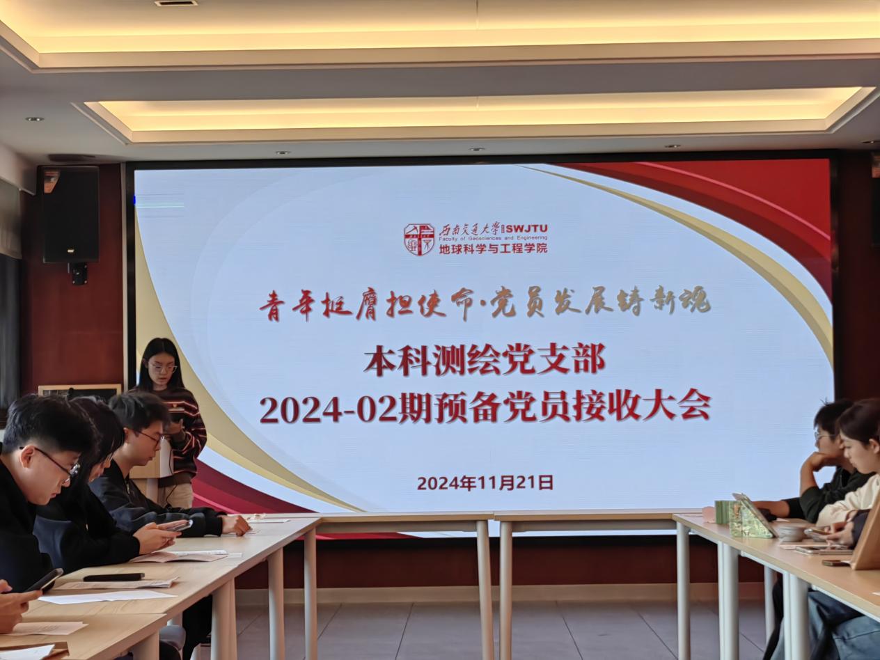 为进一步加强党支部队伍建设工作,切实提高党员发展对象综合素质,严把党员发展质量关,充分发挥党员先锋模范作用和党组织战斗堡垒作用。本科测绘党支部于2024年11月21日16:00于X4520开展了2024-02期预备党员接收大会。大会审议、讨论、表决关于罗正午等八位同志接收为中共预备党员的相关事宜。本次活动由党支部书记胡嘉祎主持,党支部七名正式党员,十二名预备党员以及八名发展对象出席本次会议,此外还有四名入党积极分子列席本次会议。