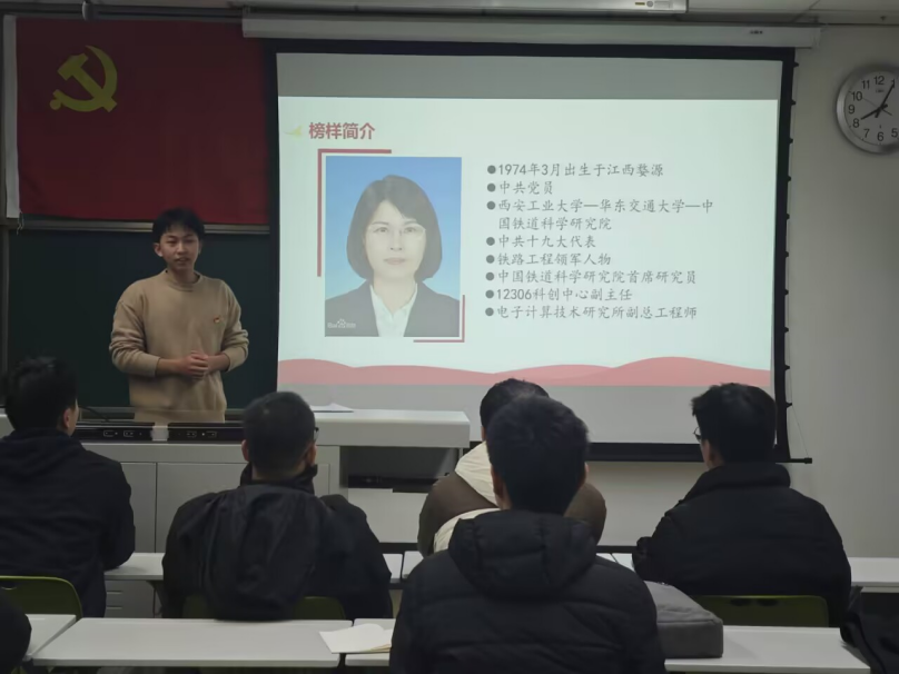 接着,支部党员荣江坤同志领学“榜样故事会”第二期——“时代楷模”单杏花事迹分享,单杏花教授深耕铁路客票领域,面对海量数据与复杂需求,以非凡毅力钻研技术难题,从传统售票系统的升级到互联网购票平台的优化,她一路攻坚克难,单杏花教授用行动证明,只要心怀热忱、脚踏实地,就能在专业领域发光发热。荣江坤同志鼓励全体同志潜心科研,以单杏花同志为榜样,书写自己的奋进篇章,积极成长为祖国的中坚力量、栋梁之才。