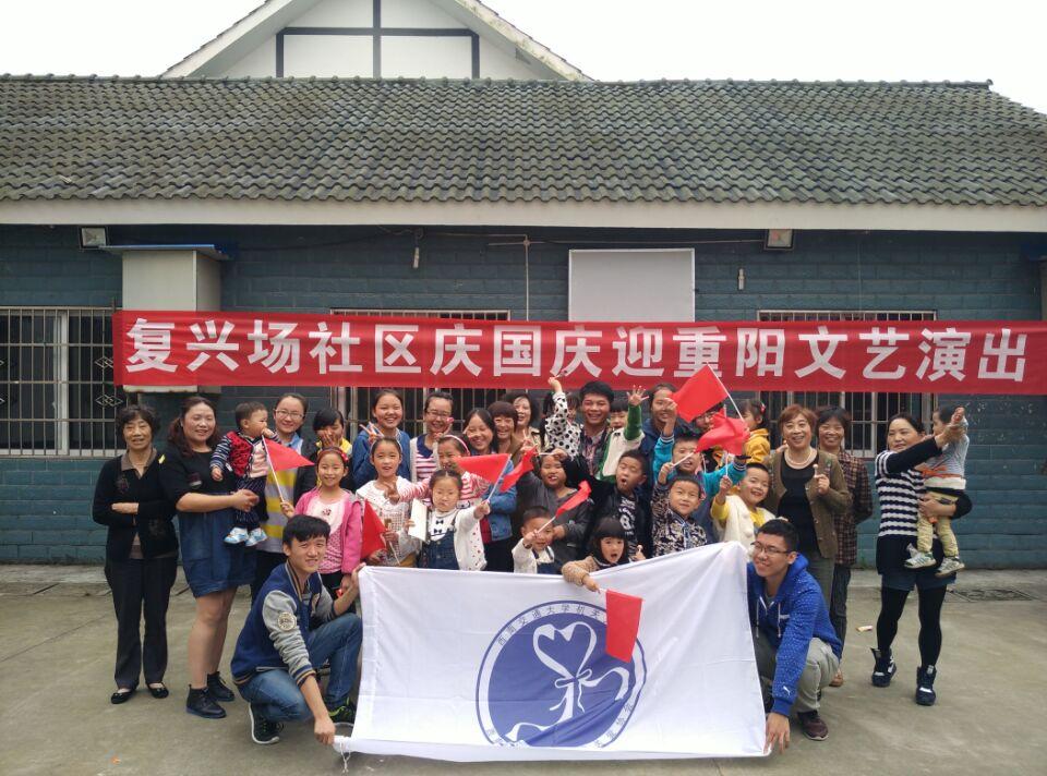 服务队的队员们陪着他们从春眠不知晓读到离离原上草,从洗澡歌唱到拔萝卜。科普课上,队员们更是手把手的教会了孩子们体温计的使用……两天多的时间里,服务团队也在迅速成长,从最初的手忙脚乱到从容的面对各种状况,自身社会实践和志愿服务能力也再提高。10月5日上午,写有“复兴场社区庆国庆迎重阳文艺汇演”的红色横幅鲜艳夺目,由孩子们,家长们准备的节目轮番登场,虽然准备的时间很短,节目也并不是很精致,气氛却出奇的好,掌声中氤氲着温情。最后,六名志愿者以一首《朋友》收尾,“朋友一生一起走,那些日子不再有,一句话,一辈子,一生情,一杯酒”,志愿者队员们和孩子们是朋友,与年龄无关,以爱之名,志愿者们以青春筑起友谊的桥梁。