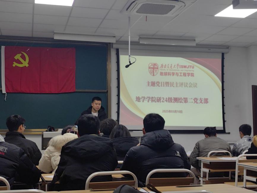 研24级测绘第二党支部在九里校区J2602教室成功举办3月党日活动暨民主评议会议。此次活动旨在深入学习贯彻习近平新时代中国特色社会主义思想,强化党性教育,增强组织凝聚力,提高党员思想觉悟。