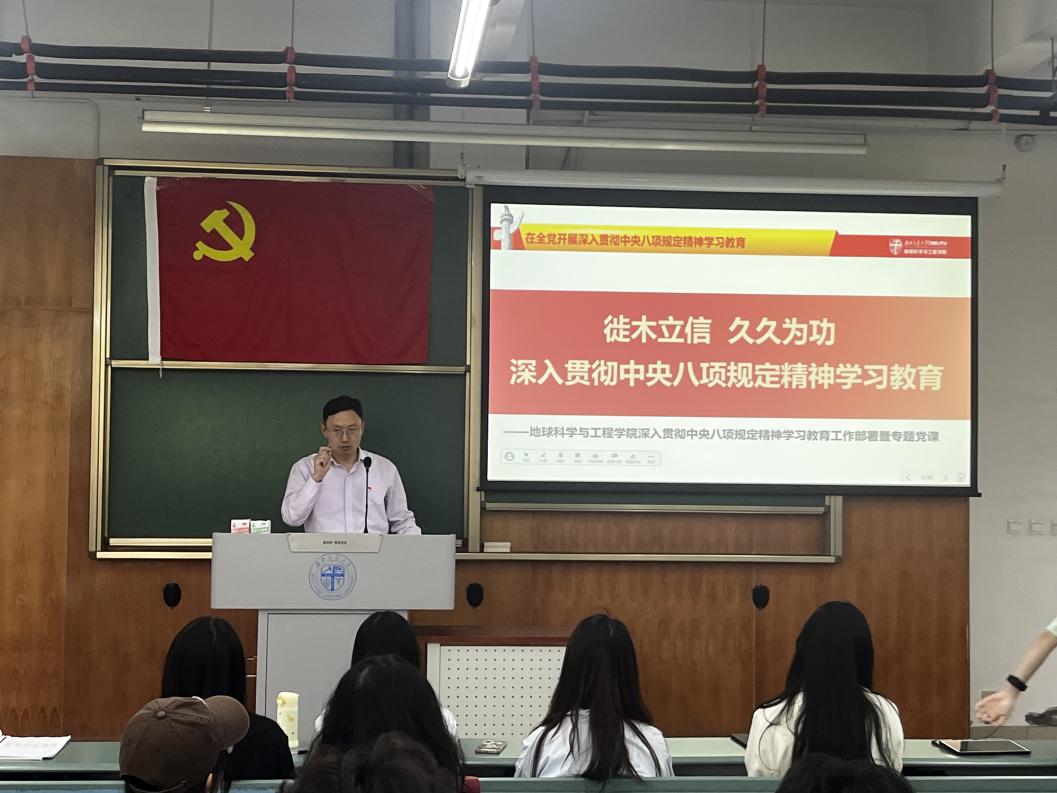 学习完两会精神后,郑波书记又为大家讲授了以“深入贯彻中央八项规定精神学习教育”专题党课。党性、党风、党纪是有机整体,党性是根本,党风是表现,党纪是保障。郑波书记指出,党中央决定在全党开展深入贯彻中央八项规定精神学习教育,恰逢其时,意义非凡。我们要深刻认识到,此次学习教育是关键之年的关键举措,是凝聚人心、巩固党执政基础的治本之策,是汇聚事业发展强大合力、以优良作风推动事业蓬勃发展的战略之谋,更是坚持党建引领,推动一流大学加速迈向卓越、助力教育强国建设的务实之行。
