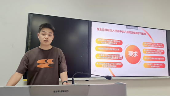 随后,研23级地质第二党支部围绕“以木为信、以石为鉴——地质人的‘徙木立信’与廉政担当”主题展开深入贯彻中央八项规定精神的学习活动。入党积极分子苟长林同学结合中央八项规定精神及“监督执纪”的四种形态,并融入具体案例,使大家对八项规定有了更深刻的理解。