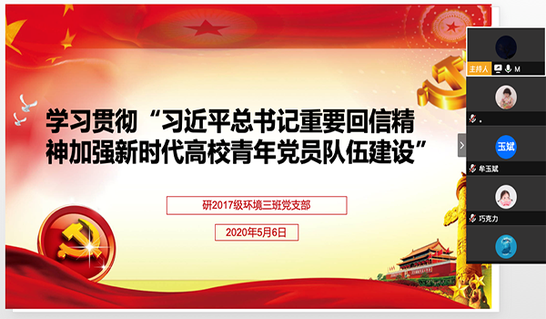 2020年3月15日,习近平总书记给北京大学援鄂医疗队全体“90后”党员回信,高度赞扬了北京大学援鄂医疗队的青年党员在疫情防控斗争的一线不畏艰险、冲锋在前、舍生忘死、交出合格答卷的精神,充分肯定新时代的中国青年是好样的,是堪当大任的。按照学院,研17级环境三班党支部于5月6日通过腾讯会议开展学习贯彻“习近平总书记重要回信精神加强新时代高校青年党员队伍建设”云上组织生活会。