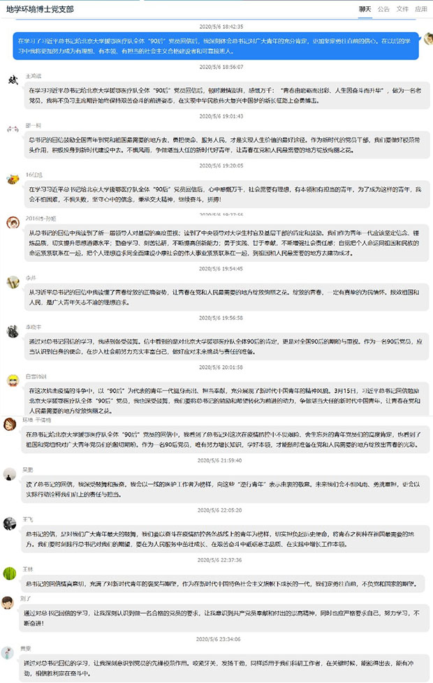 202056日,地学博士环境党支部在腾讯QQ群平台上召开了学习贯彻习近平总书记给北京大学援鄂医疗队全体“90党员重要回信精神交流研讨会。本次党日活动旨在认真学习领会、全面贯彻落实习近平总书记重要回信精神。这对于打赢疫情防控阻击战、平安校园保卫战,加强新时代高校青年党员队伍建设具有十分重要的意义。